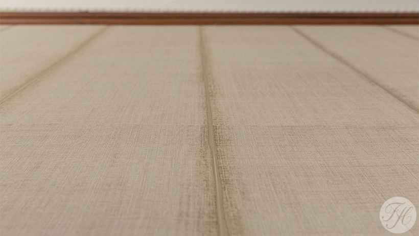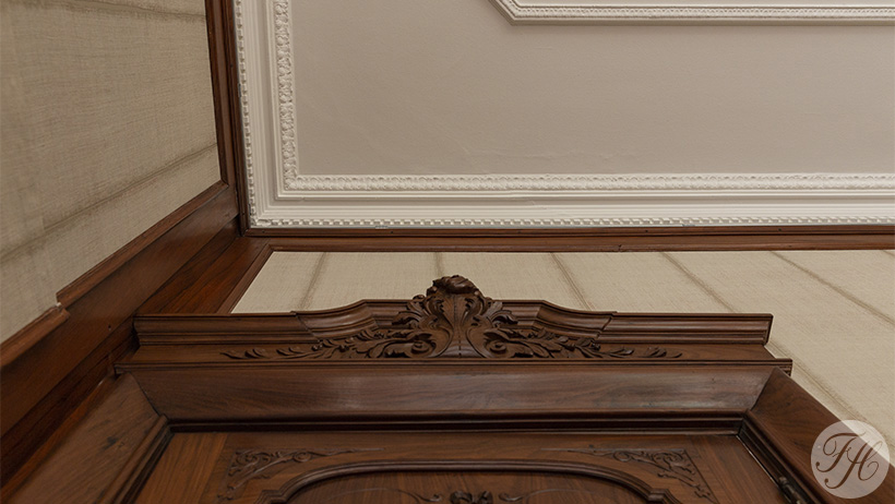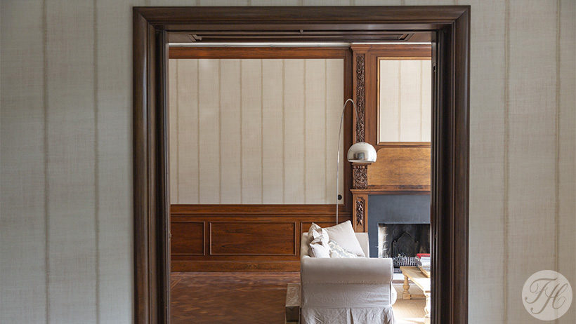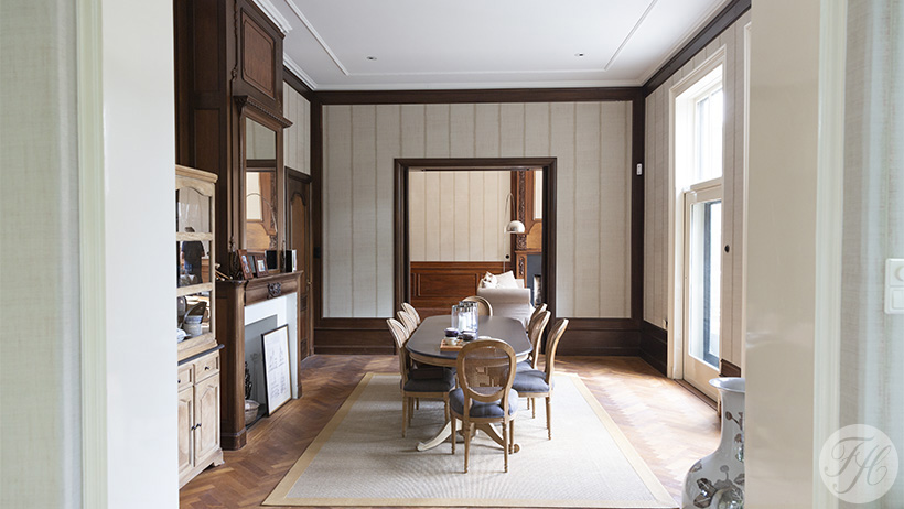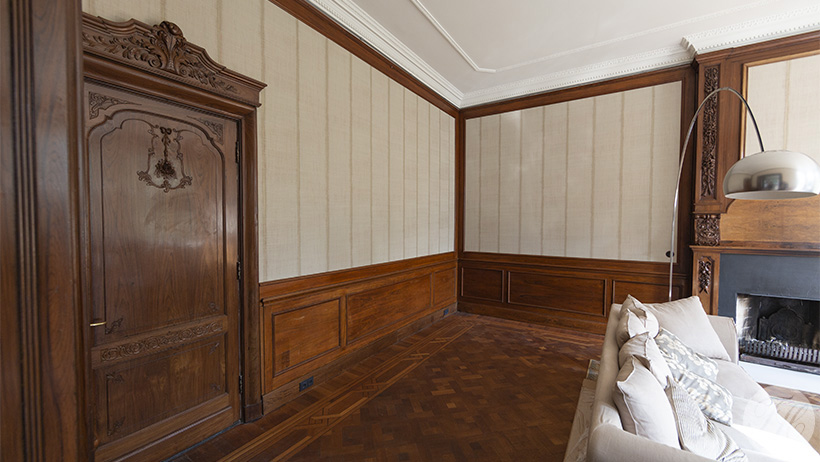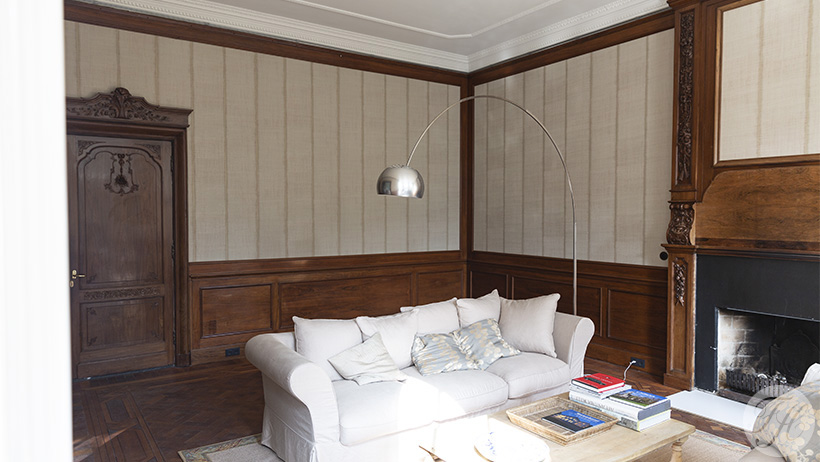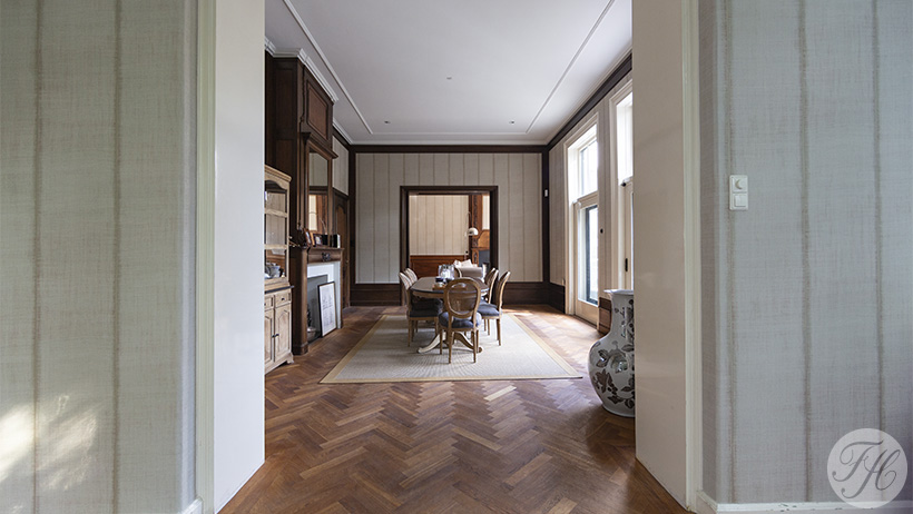 Door de aannemer de laatste renovatie werkzaamheden uitgevoerd in een landhuis gelegen aan de duinrand van Bloemendaal. De woonkamer en zijkamer hadden authentieke betengeling, deze is verwijderd en opnieuw klassiek aangebracht met gespannen linnen en beplakt met twee lagen grondpapier. Hier overheen is een passend behang aangebracht.